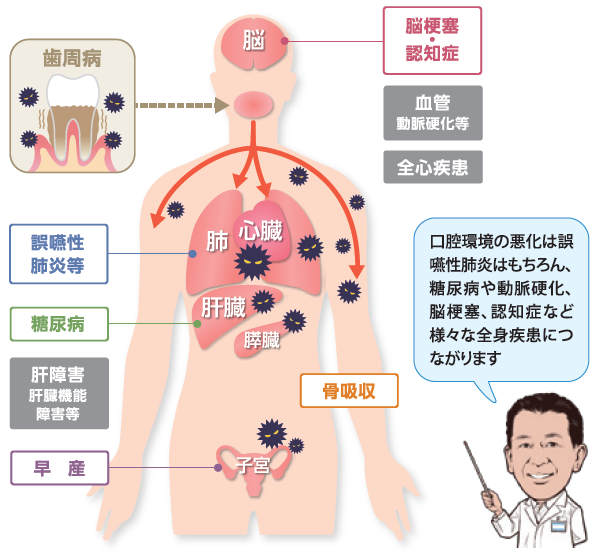 最近の研究で、歯周病が全身に悪影響を及ぼすことが次々と報告されています。歯周病菌が産生するLPS(内毒素)が歯周組織を破壊し、血流を通して全身に伝播されることで悪影響が及ぼします。